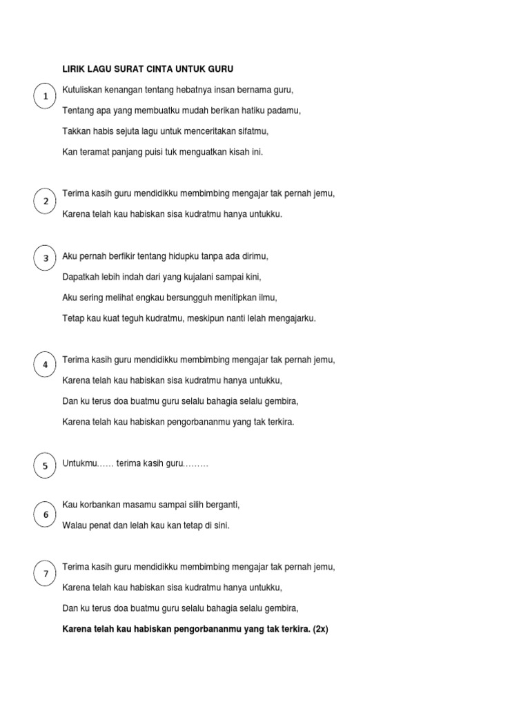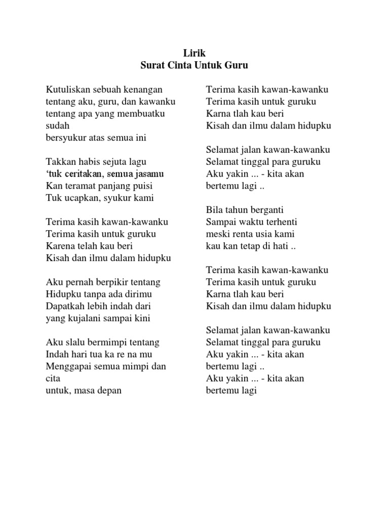 LAGU SURAT CINTA UNTUK GURU LIRIK Ditulis Roger Mcdaniel Jumat, 18 Februari 2022 Tulis Komentar Edit Lirik Pdf Surat Cinta Untuk Guru Lirik Youtube Lirik Lagu Surat Cinta Untuk Guru Pdf Lirik Surat Cinta Untuk Guru Pdf Bagikan Artikel ini